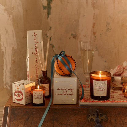 「オレンジポマンダー」から着想を得た「ドライオレンジ&シナモンバーク」の香り。「オレンジポマンダー」は、中世ヨーロッパで魔除けや幸運のお守りとして作られた、オレンジにクローブを挿して飾りつけた香り玉です。祝祭の飾りや贈り物として親しまれ、冬を彩る象徴的な存在です。みずみずしいオレンジとシナモンの温かな甘さに、クローブやナツメグが重なり合う香りが英国のホリデーへと誘います。