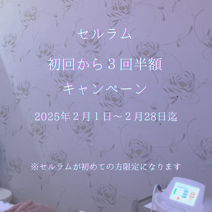 セルラムを導入して1年。2月は、セルラム初回から3回まで半額チケットのキャンペーンを行います!通常は、初回のみ半額とさせて頂いております。